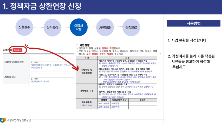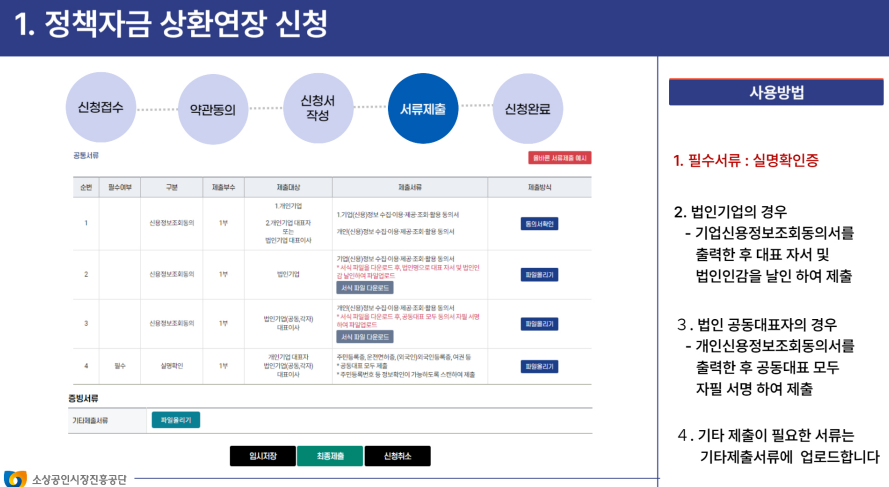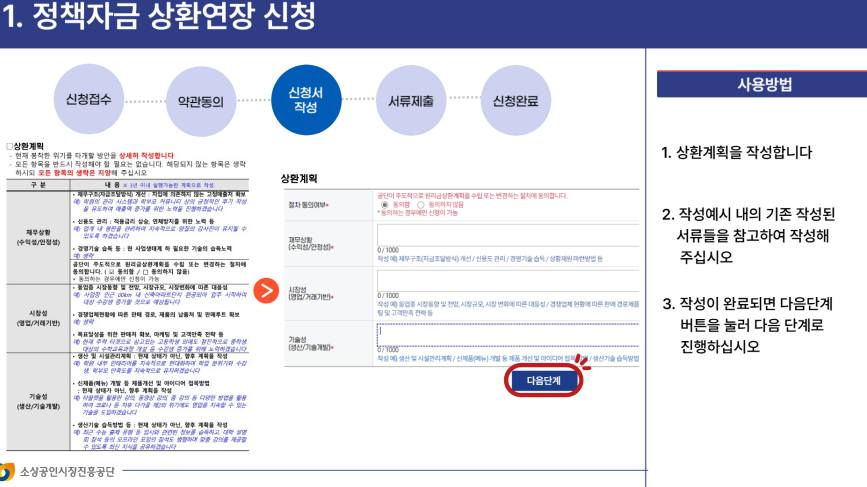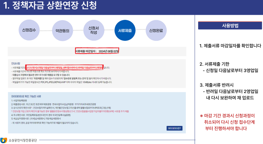 - 상환 연장 신청서 제출: 소상공인은 상환 연장을 신청하기 위해 해당 금융기관이나 정부 기관에 신청서를 제출해야 합니다. 이 신청서에는 사업자의 재정 상태와 상환 연장의 필요성을 입증할 수 있는 자료가 포함되어야 합니다.