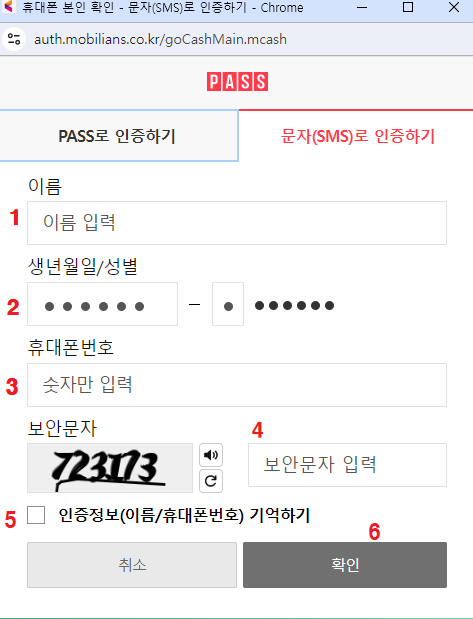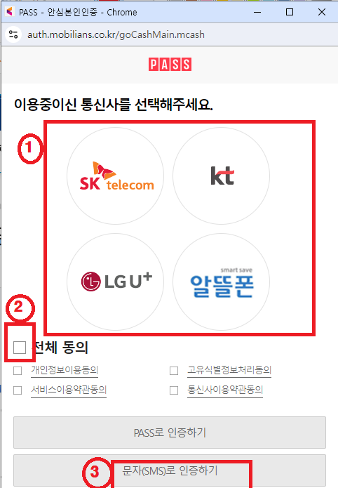 5. 1, 2, 3 순서대로 통신사와 동의 버튼을 누르시고 문자로 인증하기를 눌러줍니다.