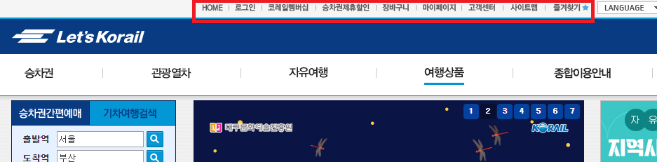 1. 코레일 홈페이지에 접속 후 상단에 빨간색 네모상자 로그인 버튼을 눌러줍니다.